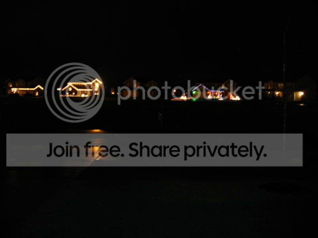 EDIT: I snapped a quick slowed shutter shot for you to see below. Note the raindrop in the foreground!  :biggrin: It's a little blurry because I wasn't about to get the tripod out and so held the camera by hand, but you get the idea. The house with the purple/blue lights outlining the peak has more lights than those that are showing. My shot just captured some of the lighting and missed some of the green grass outline, among other items. . .  :spooked: