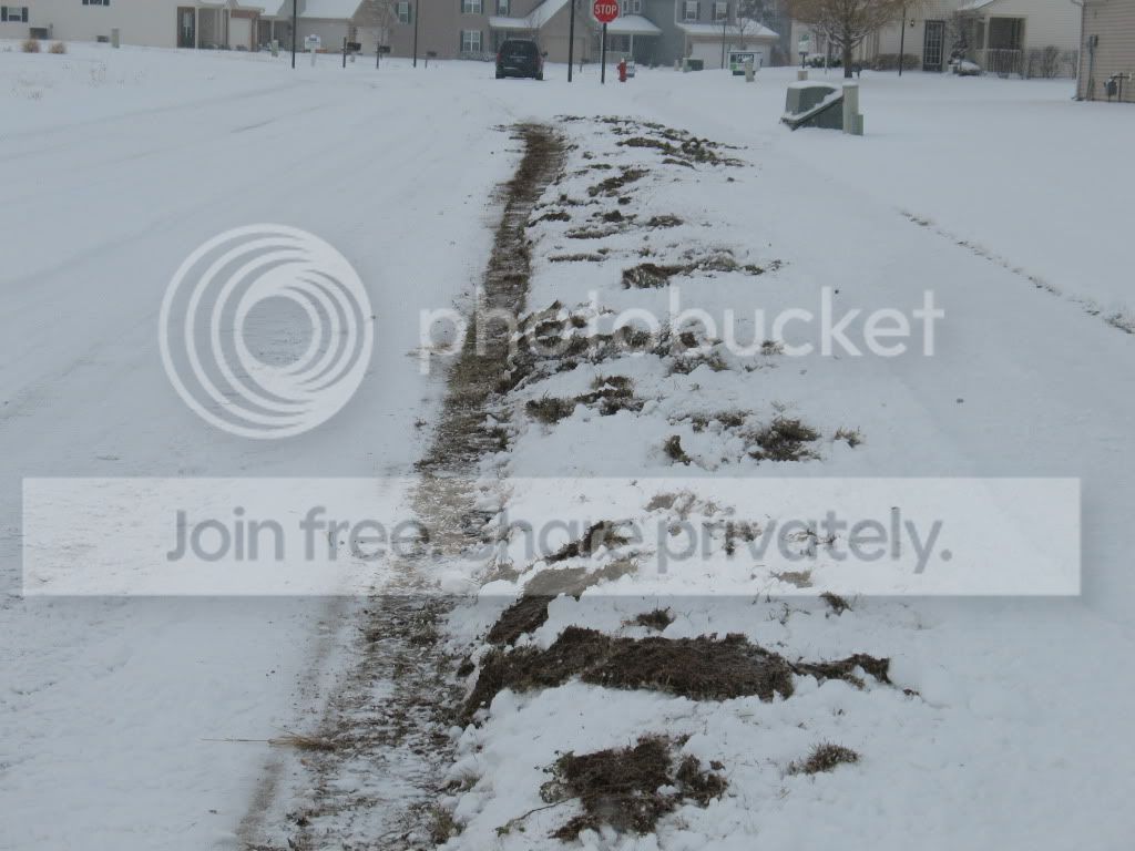 I stopped the guy just before I took the first picture of the plow (Plate number 26165 as is clearly visible in the picture of it) I asked him if he had seen what he had done to my parkway? He said, "Oh we'll clean it up when the weather breaks". BULLSHIT! That is the sod that runs 90% of the parkway the length of my property! And he has peeled it all off, to the dirt!